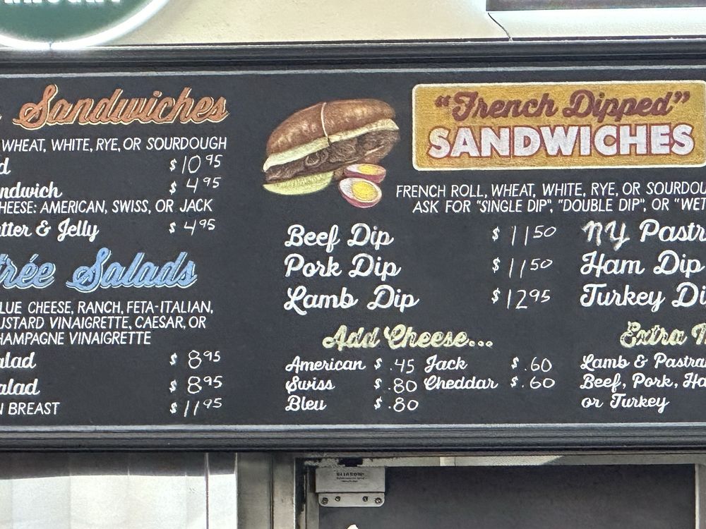 NY style pastrami on a french roll. Choose from single dip (top bread dipped), double dip (top and bottom bread dipped), wet or dry (dip on the side). House recommends double dip!